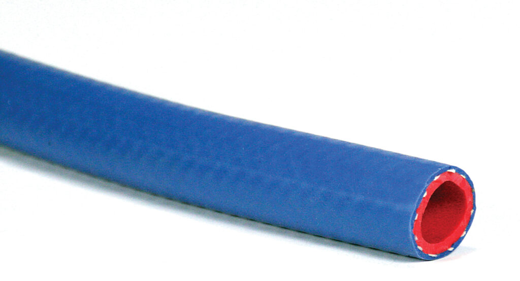 This red silicone hose is covered with a blue silicone and multiple layers of polyester fabric. It resists to abrasion and to heat.