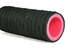 Tube de caoutchouc naturel de 3/8" d'épaisseur, recouvert de caoutchouc synthétique noir ondulé avec une spirale d'acier, et renforci de plusieurs plis de tissus synthétiques.